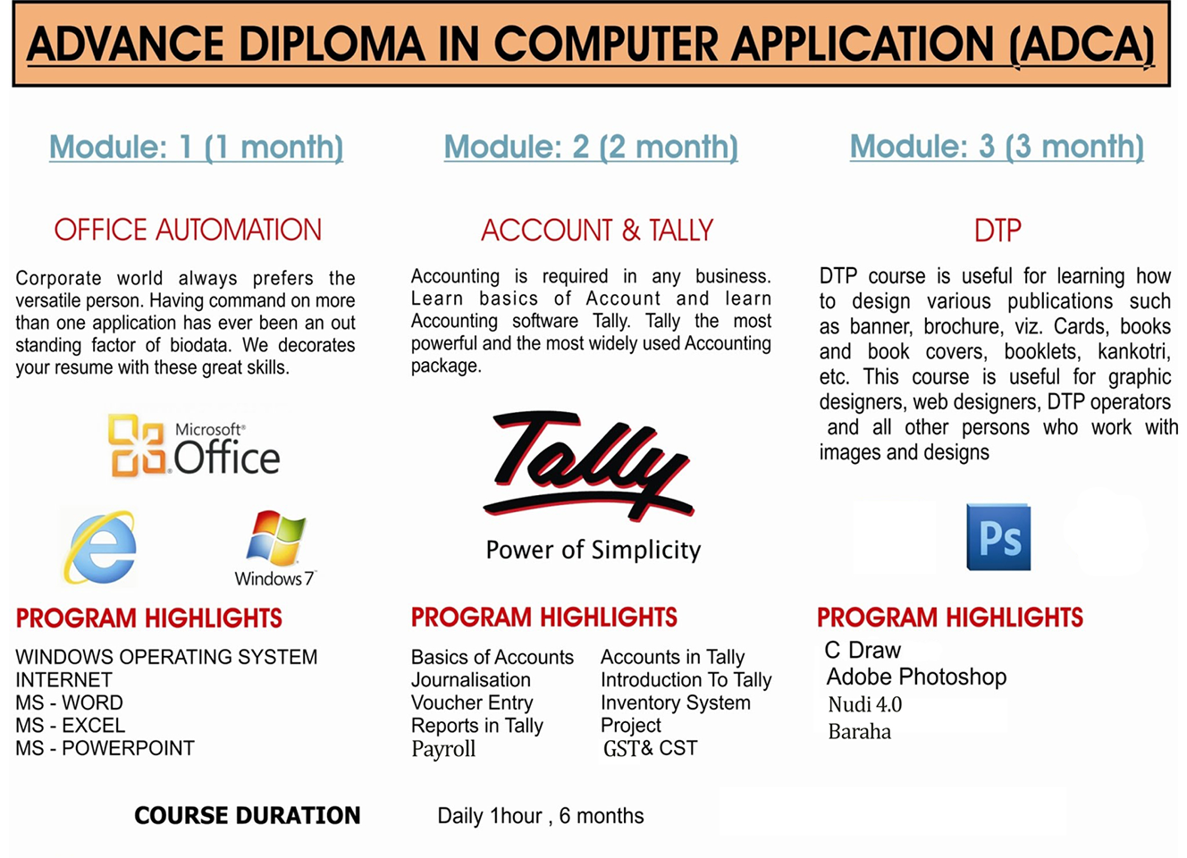 | 4 | Diploma in Computer Application – Stream 2 | Office Automation, MS Outlook Express, Tally Basics, Kannada Packages, Photoshop, Corel Draw, PageMaker | 12 Months |